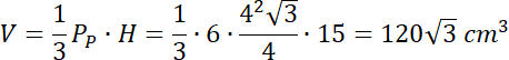 Wyznacz objętość ostrosłupa prawidłowego sześciokątnego, którego wysokość jest równa 15 cm, a obwód jego podstawy jest równy 24 cm.