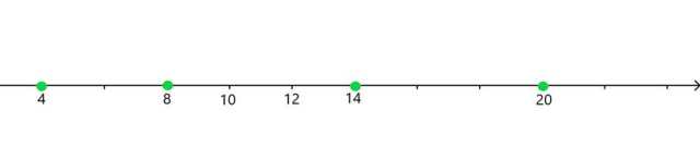 Zaznacz liczby na osi liczbowej. Na tej osi liczbowej jednostka wynosi 2. Liczba 4 znajduje się trzy kreski niżej od liczby 10, bo 10 – 4 = 6, 6 : 2 = 3. Liczba 14 znajduje się jedną kreskę nad liczbą 12, bo 14 – 12 = 2, 2 : 2 = 1. Liczba 20 znajduje się 4 kreski wyżej niż liczba 12, ponieważ 20 – 12 = 8, 8 : 2 = 4.