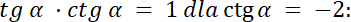 W tym zadaniu wyznacz z równania: tg α ⋅ ctg α = 1, wartość funkcji ctg α. Ze wzoru na tangens kąta wyznacz zależność między sinusem a cosinusem kąta i skorzystaj z jedynki trygonometrycznej, aby wyznaczyć dokładne wartości funkcji sinus i cosinus kąta.