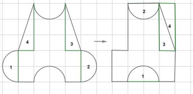 W tym zadaniu zauważ, z jakich figur składa się figura i przekształć figurę z treści zadania, w taki sposób, aby otrzymany, nowy kształt zajmował całkowitą powierzchnię kratki. Wiemy, że jedna kwadracik–ma pole równe 1, więc po przekształceniu, policz, ile kratek zajmuje figura.