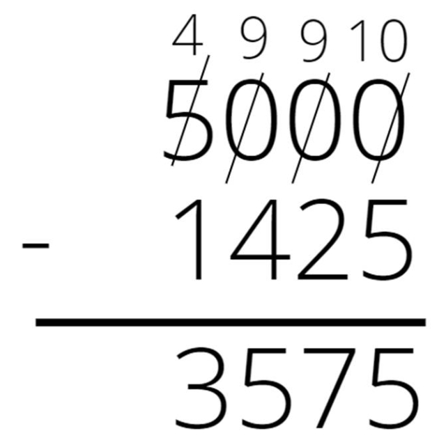 Zapisz liczby jedna pod drugą. Odejmuj kolumnami. Jeśli cyfra górna jest mniejsza od dolnej, to dodaj do niej 10, a cyfrę po lewej stronie zmniejsz o 1 i wykonaj odejmowanie na nowo powstałych liczbach. Jeśli nowo napisana liczba jest mniejsza od dolnej cyfry, to powiększ ją o 10, a następną cyfrę po lewej zmniejsz o 1. Jeśli musimy zmniejszyć o 1 cyfrę 0, to zamień ją na 9 i zmniejsz o 1 następną cyfrę po lewej stronie.