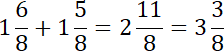Dodając do siebie liczby mieszane, na początku zsumuj części całkowite, następnie zsumuj części ułamkowe. Jeżeli to możliwe, skróć część ułamkową. Gdy otrzymany ułamek jest ułamkiem niewłaściwym, wyciągnij całości i dodaj je do części całkowitej.