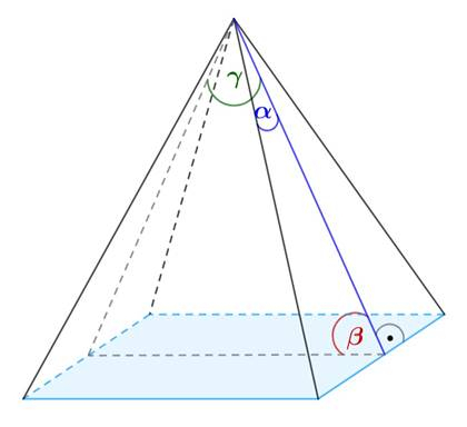 Zaznacz kąty α, β i γ oznaczające odpowiednio kąt między narysowaną wysokością ściany bocznej a krawędzią boczną, kąt między narysowaną wysokością ściany bocznej a podstawą oraz kąt między wysokością ściany bocznej a wysokością przeciwległej ściany bocznej w ostrosłupie prawidłowym czworokątnym na rysunku.