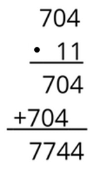 W mnożeniu pisemnym z zerem można zera z końca usunąć w zapisie i zapisać na końcu ostatecznego wyniku: 704 ∙ 11 =