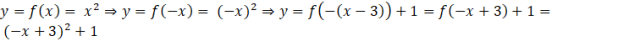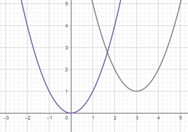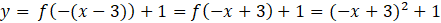 Wykres funkcji f (kolor fioletowego) odbij symetrycznie względem osi OY (wykres y = x2 jest symetryczny, więc obraz pokrywa się z wykresem funkcji f). Następnie otrzymany wykres przesuń o wektor [3, 1], otrzymując wykres koloru szarego.