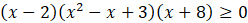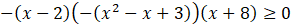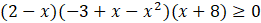 Aby rozwiązać równanie, przekształć wielomian dany po prawej stronie do postaci iloczynowej. W tym celu z czynników 2 – x oraz -3 + x – x2 wyłącz przed nawias -1. Następnie oblicz wyróżnik trójmianu kwadratowego – ponieważ jest on ujemny, trójmian nie ma pierwiastków. Naszkicuj wykres wielomianu, na którego podstawie podajmy zbiór rozwiązań nierówności.