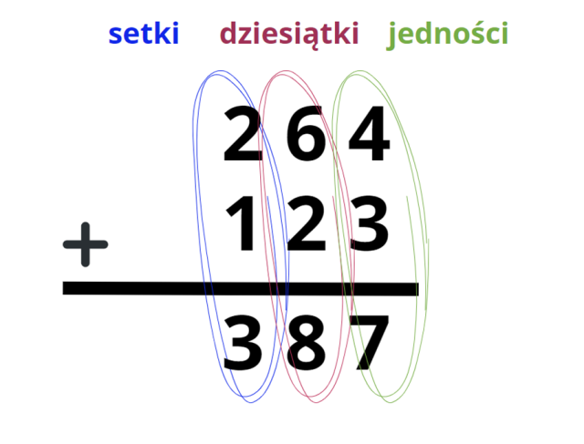 Wykonując obliczenie sposobem pisemnym, musisz zapisać cyfry jedna pod drugą, jedności pod jednościami, dziesiątki pod dziesiątkami, setki pod setkami. Obliczenie zaczynaj zawsze od prawej strony, wynik dodawania zapisuj pod kreską.