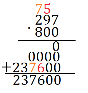 Pomnóż 297 przez 0. Przenieś się w lewo do kolejnej cyfry. Zapisz wynik w nowym rzędzie poniżej, przesunięty o dodatkowe 0. Każda cyfra pomnożona przez 0 daje nam 0, więc zapisz dodatkowe trzy 0, teraz pomnóż 8 przez 297, zaczynając od 7, pomnóż 7 i 8, zapisz ostatnią cyfrę z wyniku (6), następnie przenieś 5, pomnóż 9 i 8 i dodaj przeniesioną cyfrę do wyniku, zapisz ostatnią cyfrę wyniku i przenieś 7, pomnóż 2 i 8 i dodaj przeniesioną cyfrę do wyniku, przepisz cały wynik i dodaj do siebie wszystkie liczby, w tym przypadku to będą same zera.