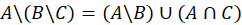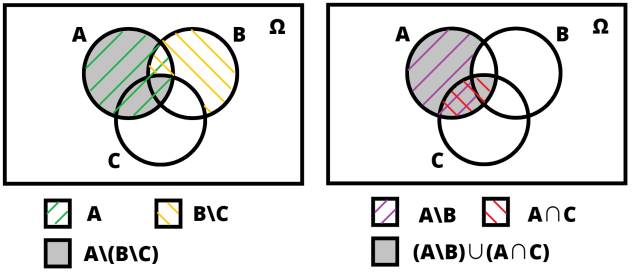 Zaznacz na pierwszym diagramie obszar B\C, a następnie A\(B\C), a na drugim – sumę obszarów A\B i części wspólnej A i C. Obszary na obu diagramach pokrywają się, c. n. d.