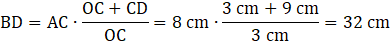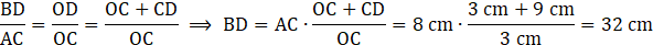 W tym zadaniu musisz obliczyć długość boku BD, wiedząc, że ramiona kąta o wierzchołku O przecięto dwiema prostymi równoległymi, które na jednym ramieniu kąta wyznaczają punkty A i B, a na drugim odpowiednio punkty C i D.