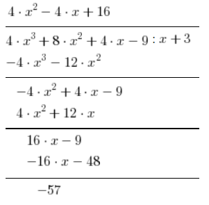 Pierwszy od lewej wyraz wielomianu kwadratowego dzielimy przez pierwszy wyraz podanego dwumianu. Następnie mnożymy go przez dzielnik x - 4 i wynik podpisujemy pod dzielną i odejmujemy go od niej poprzez dodanie wielomianu o przeciwnych współczynnikach. Otrzymujemy pierwszą resztę z dzielenia w ten sposób. Powtarzamy opisaną procedurę, dopóki nie otrzymamy wielomianu stopnia niższego niż dwumian przez które dzielimy. Jeśli jest to wieloma zerowy, to wieloma dzieli się bez reszty.