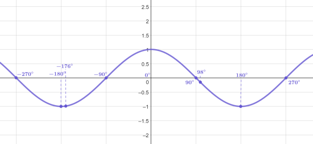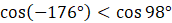 Dane są wyrażenia: cos(-176°) oraz cos 98°. Na bazie wykresu funkcji y = cos α ustal, które z nich ma mniejszą wartość.