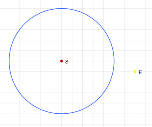 Musisz narysować okrąg, którego średnica jest równa 25, środek nazywa się S i zaznaczyć kolorem żółtym punkt znajdujący się na zewnątrz okręgu.