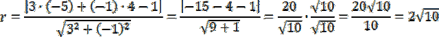 Zacznij od zapisania równania prostej w postaci ogólnej. Zauważ, że odległość środka okręgu od stycznej jest równa promieniowi, ponieważ prosta l jest styczna do okręgu. Skorzystaj ze wzoru na odległość prostej od punktu, aby obliczyć długość promienia okręgu.