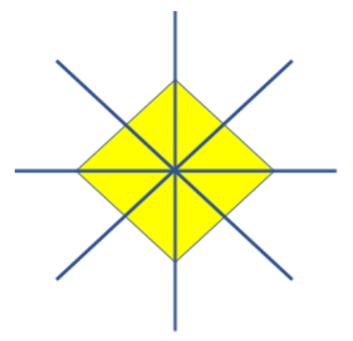 Cztery osie symetrii, poprowadzone w taki sposób jak na poglądowym rysunku.