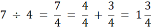 Zapisz iloraz 7 • 4 w postaci ułamka. Jeśli powstanie ułamek niewłaściwy, wyłącz z niego całości.