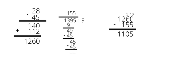 28 ∙ 45 – 1395 : 9 = 1260 – 155 = 1105