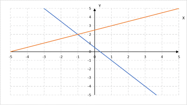 Układy te są układami oznaczonymi, co świadczy o tym, że proste przecinają się w jednym punkcie i mają jedno rozwiązanie. Aby przedstawić interpretację geometryczną, należy równania doprowadzić do postaci kierunkowej tzn. y = ax + b, następnie narysować w jednym układzie współrzędnych i odczytaj punkt przecięcia prostych, będący rozwiązaniem tego układu.