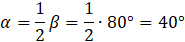 Jako β oznacz kąt przyległy do kąta 100°. Suma miar kątów przyległych jest równa 180°. Kąt β jest kątem środkowym opartym na tym samym łuku co kąt α, więc jego miara jest dwa razy większa od miary α.