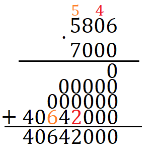 Pomnóż 5806 przez 0. Przenieś się do cyfry po lewej, zapisz wynik w nowym rzędzie niżej, przesunięte o dodatkowe 0, pomnóż zera ze sobą, zapisując je w nowym rzędzie, teraz pomnóż 7 przez 6, zapisz ostatnią cyfrę wyniku, przenieś 4, pomnóż 0 i 7 i dodaj przeniesioną cyfrę do wyniku, przepisz wynik, pomnóż 8 i 7 i zapisz ostatnią cyfrę wyniku, następnie przenieś 5, pomnóż 5 i 7 i dodaj przeniesioną cyfrę do wyniku, przepisz wynik i dodaj wszystko do siebie.
