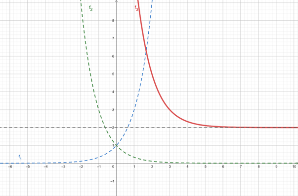 Naszkicuj wykres funkcji według podanego przepisu. Odbij wykres symetrycznie względem osi OY, a następnie przesuń o trzy jednostki 2 prawo i dwie jednostki do góry. Pamiętaj, że asymptota pozioma funkcji po przekształceniach będzie w y = 2. Odczytaj przecięcia z osiami z wykresu lub oblicz podstawiając odpowiednio za x i y zero.