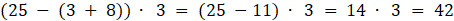 Najpierw wykonujemy działania w tych nawiasach, które nie mają w sobie innych nawiasów, a następnie mnożenie: