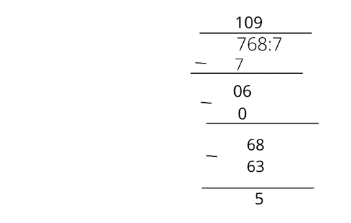 Sprawdzamy, ile 7 mieści się w 7, tylko jedna, a więc zapisujemy nad kreską 1 i mnożymy 1 razy 7. Wykonujemy odejmowanie. Zostaje nam liczba 0 i przepisujemy 6 zapisaną powyżej, i teraz zastanawiamy się, ile 7 mieści się w 6. Robimy tak z każdą liczbą po kolei. Jeśli zrobimy tak, z wszystkimi liczbami a na dole pozostanie nam cyfra, a nie zero, to oznacza, że jest to reszta z dzielenia.