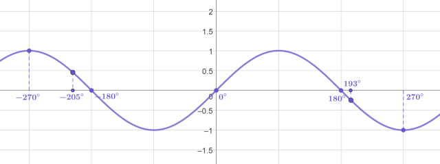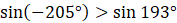 Dane są wyrażenia: sin(-205°) oraz sin 193°. Bazując na wykresie funkcji y = sin α podaj, które z nich ma większą wartość.