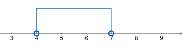 Zaznacz początek i koniec przedziału i wszystkie liczby pomiędzy. Przedział jest otwarty na 4 i na 7, więc kropki powinny być niezakolorowane.