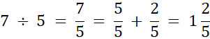 Zapisz iloraz 7 • 5 w postaci ułamka. Jeśli powstanie ułamek niewłaściwy, wyłącz z niego całości.