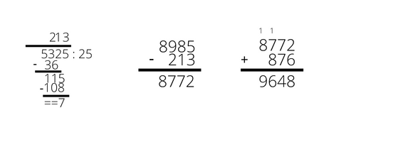 8985 – 5325 : 25 + 876 = 8985 – 213 + 876 = 8772 + 876 = 9648