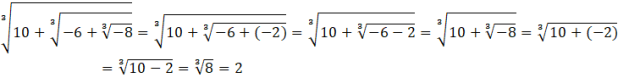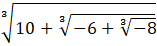 W tym zadaniu musisz obliczyć najpierw wewnętrzny pierwiastek sześcienny. Od otrzymanego wyniku musisz odjąć 6 i spierwiastkować pierwiastkiem trzeciego stopnia. Do tego wyniku musisz dodać 10 i ponownie spierwiastkować pierwiastkiem trzeciego stopnia.