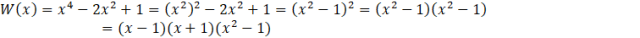 Aby znaleźć wielomian stopnia pierwszego, przez który jest podzielny wielomian W(x) przedstaw wielomian W(x) w postaci iloczynu. W tym celu skorzystaj kolejno ze wzorów skróconego mnożenia na kwadrat różnicy i różnicę kwadratów.