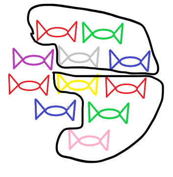 Podziel 11 cukierków na porcje po 4 cukierki i otocz je obwódką. Odpowiedz na pytania.