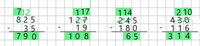 Odejmowanie pisemne polega na odejmowaniu cyfr w jednej kolumnie. Od cyfry leżącej powyżej odejmujemy liczbę leżącą poniżej i zapisujemy wynik pod kreską. Jeżeli liczba powyżej jest za mała, aby odjąć od niej liczbę poniżej, skreślamy liczbę po lewej i zmniejszamy ją o 1, a naszą liczbę powiększamy o 10 i wykonujemy odejmowanie.