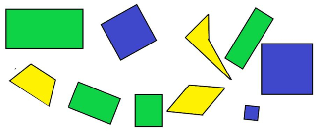 Pokoloruj kwadraty – na niebiesko, prostokąty, które nie są kwadratami – na zielono, a inne figury na żółto.