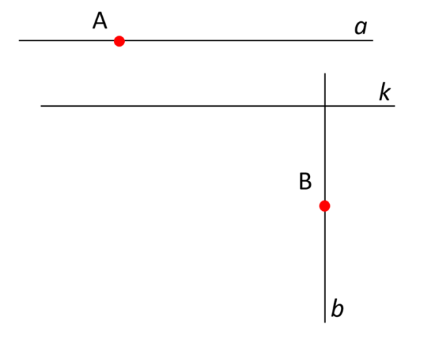 W tym zadaniu narysuj prostą k oraz 2 punkty: A i B, które nie będą leżeć na tej prostej. Następnie narysuj prostą a, równoległą do prostej k, przechodzącą przez punkt A oraz prostą b, prostopadłą do prostej k, przechodzącą przez punkt B.