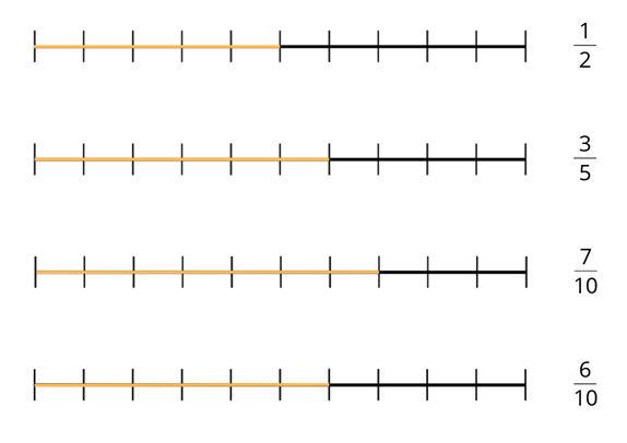 Przedstawione odcinki podzielone są na 10 mniejszych odcinków. Sprowadź każdy z ułamków do liczby 10 w mianowniku, liczba z licznika wskaże Ci ile małych odcinków musisz zaznaczyć kolorem.