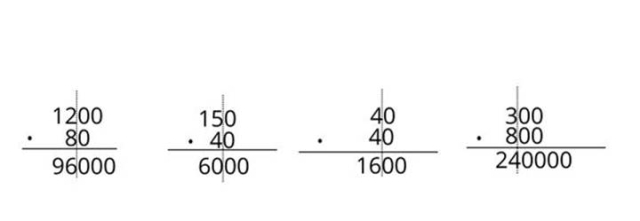 Oblicz sposobem pisemnym: 80 × 1200, 150 × 40, 402, 300 ×800.