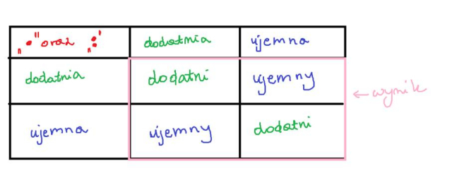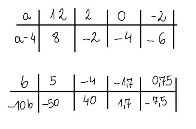 W drugim wierszu za a podstaw liczbę, która jest podana w pierwszym wierszu. W drugiej tabelce w drugim wierszu podstaw za b liczbę podaną w pierwszym wierszu. Pamiętaj, że gdy mnożysz dwie liczby ujemne, to wynik będzie liczbą dodatnią, a gdy mnożysz liczbę dodatnią przez ujemną, to wynik będzie ujemny.