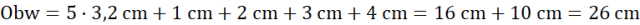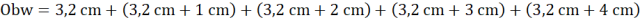 Zwróć uwagę, że, jeżeli drugi bok jest o 1 cm dłuższy od pierwszego, to trzeci bok będzie od drugiego także dłuższy o 1 cm, ale od pierwszego już o 2. Podobnie kolejne boki są od boku pierwszego dłuższe o 3 cm i 4 cm. Aby obliczyć obwód możesz pomnożyć powtarzającą się wartość 3,2 cm przez ilość boków i dodać do niej pozostałe składniki.