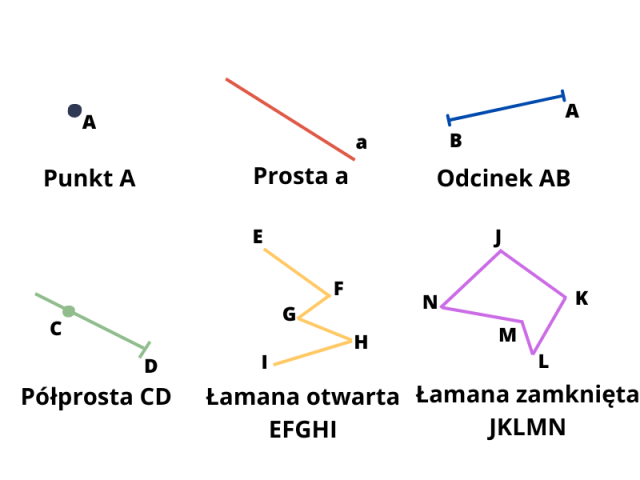 Musisz napisać nazwy podanych figur i ich oznaczenia literowe.