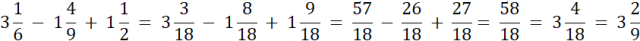 Sprowadzamy do wspólnego mianownika, zamieniamy liczby mieszane na ułamki niewłaściwe i wykonujemy działania, na koniec zamieniamy ułamek niewłaściwy na liczbę mieszaną i skracamy do najprostszej postaci.