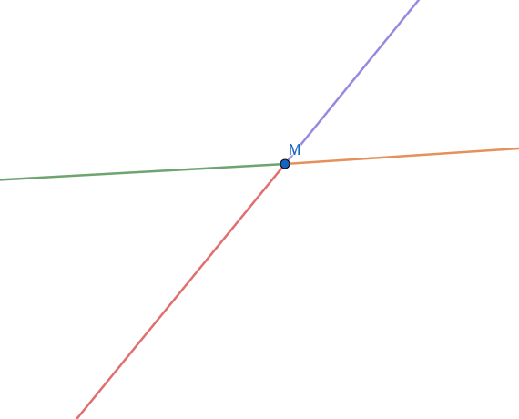 Narysuj dwie proste, które przechodzą przez punkt M i zaznacz różnymi kolorami półproste wyznaczone przez M.