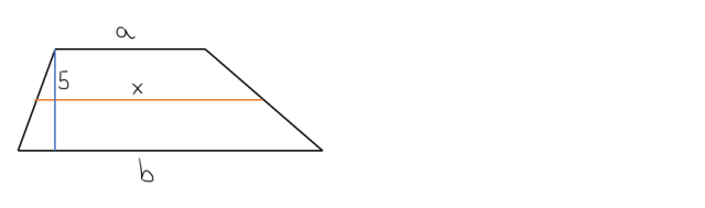 W tym zadaniu musisz obliczyć długość odcinka łączącego środki ramion tego trapezu, wiedząc, że wysokość jest równa 5 cm, a pole wynosi .