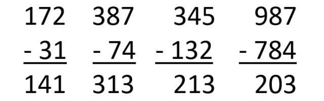 Na początku musisz zapisać pod sobą odpowiednie wartości. Następnie musisz odjąć od siebie liczby znajdujące się w tej samej kolumnie, aby otrzymać wynik, pamiętając, że jeśli od mniejszej liczby odejmujemy większą, wówczas musisz „pożyczyć” wartość dziesiątek z sąsiedniej różnicy (np. jeśli odejmujemy 2 od 3, wówczas trzeba „pożyczyć” wartość dziesiątek, co daje odejmowanie 12 – 3 oraz zmniejszenie liczby, od której została „pożyczona” wartość o 1).