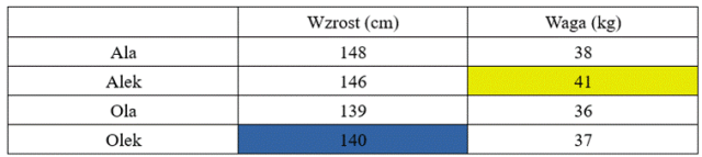 Na początku musisz zapoznać się z danymi w tabeli. Następnie musisz zaznaczyć wagę Alka oraz wzrost Olka.