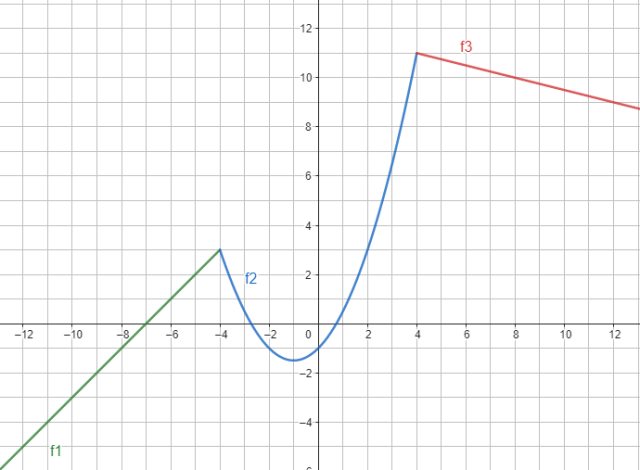 Funkcja f jest połączeniem trzech funkcji w danych przedziałach, które oznaczasz kolejno od góry przez