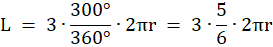 W tym zadaniu odcinki łączące środki okręgów są bokami trójkąta równobocznego, zatem długość niebieskiej linii jest sumą długości 3 łuków okręgów o promieniu r wyznaczonych przez kąt 300°