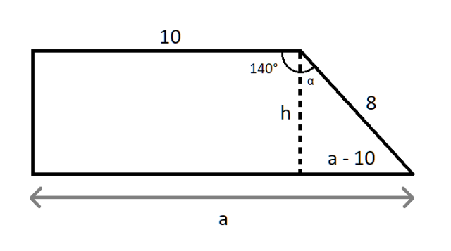Zauważ, że powstaje trójkąt ograniczony przez wysokość tego trapezu. Ponieważ wysokość jest prostopadła do boku, to kąt między wysokością a podstawami wynosi 90°. Więc trójkąt ten jest prostokątny. Kąt α z kolei możesz obliczyć odejmując 90° od 140° (gdyż kąt 140° składa się z kąta prostego i kąta α.